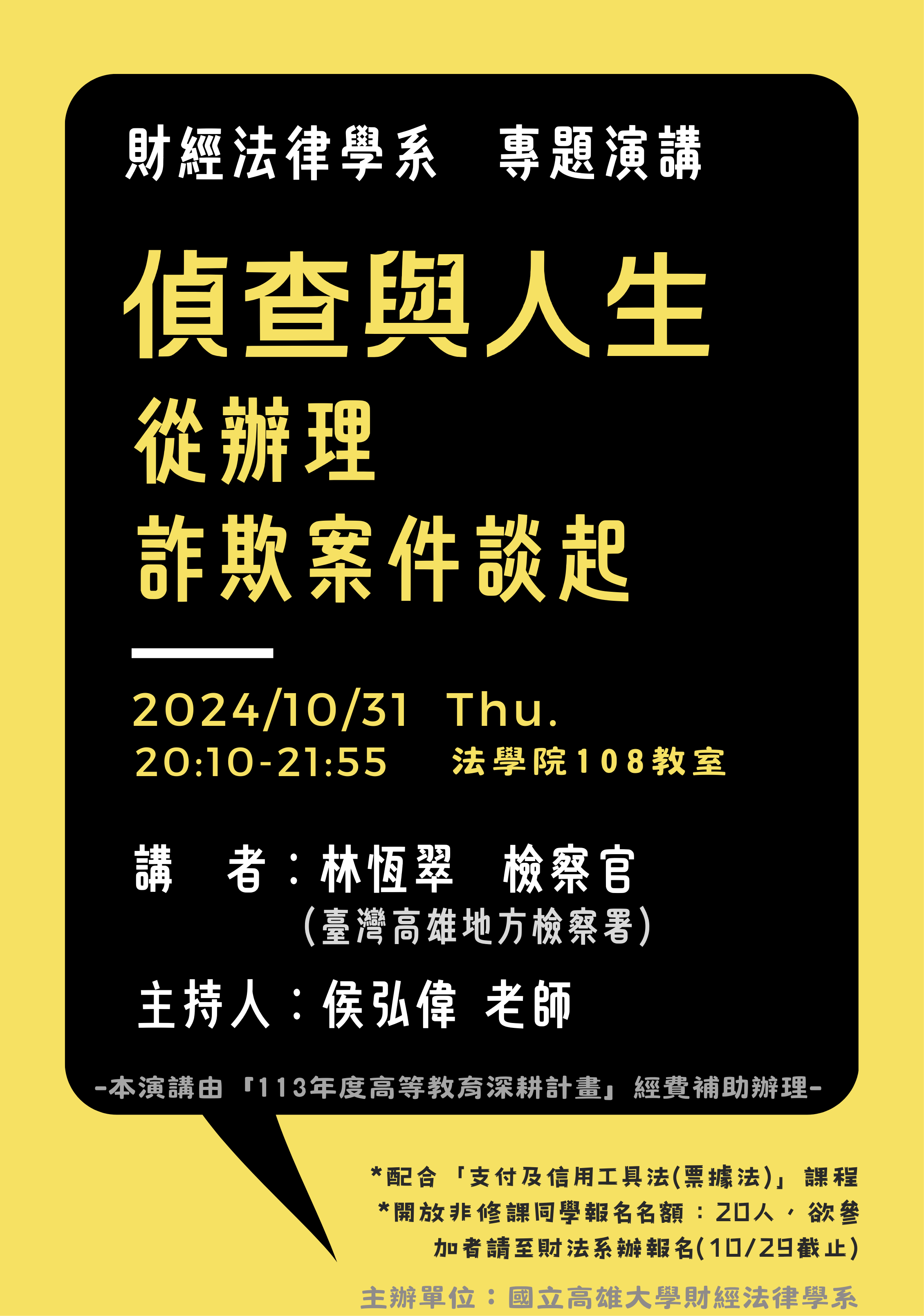 【財法系專題演講】113.10.31「偵查與人生-從辦理詐欺案件談起」專題演講