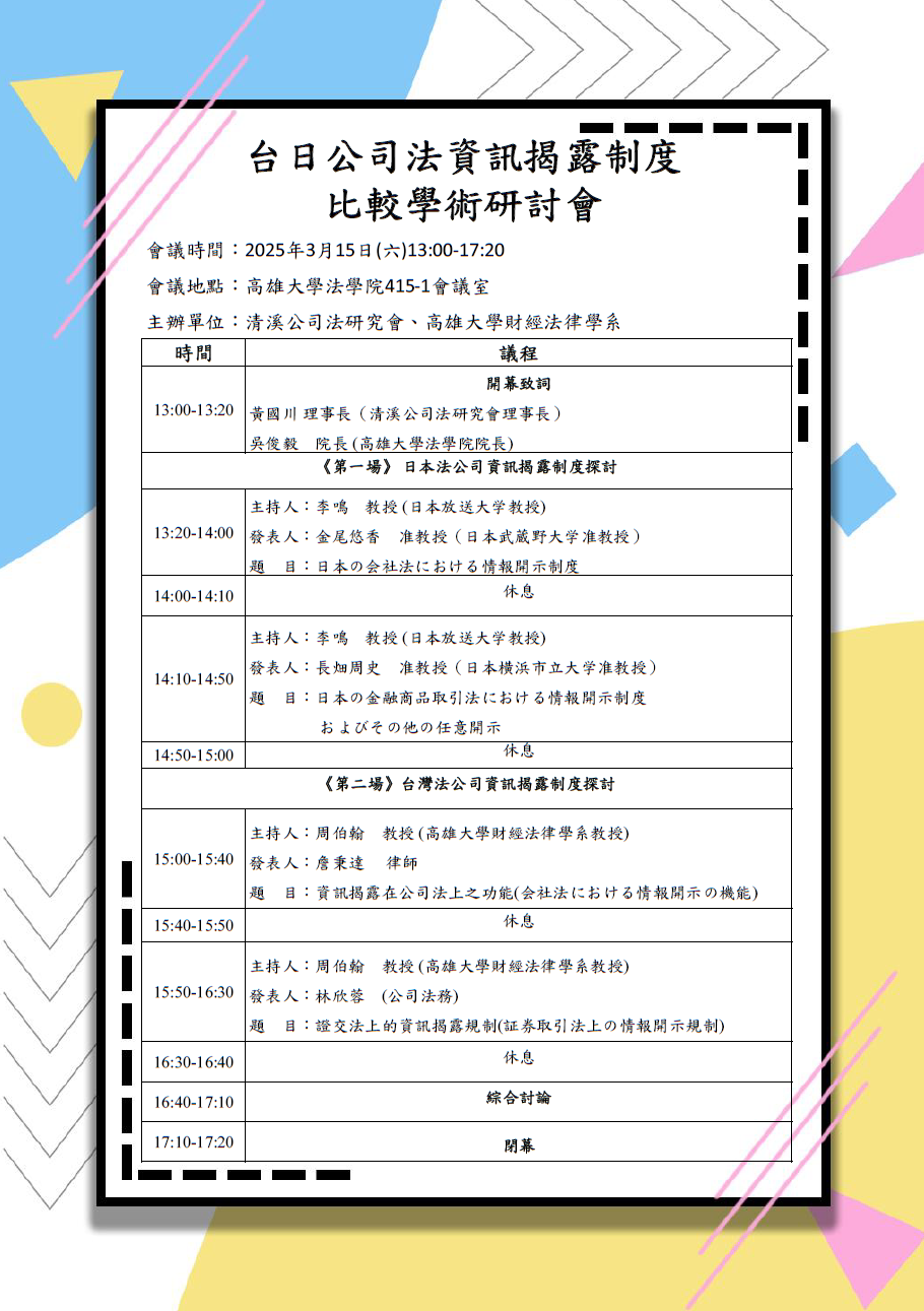 敬邀參與114.3.15「台日公司法資訊揭露制度比較學術研討會」