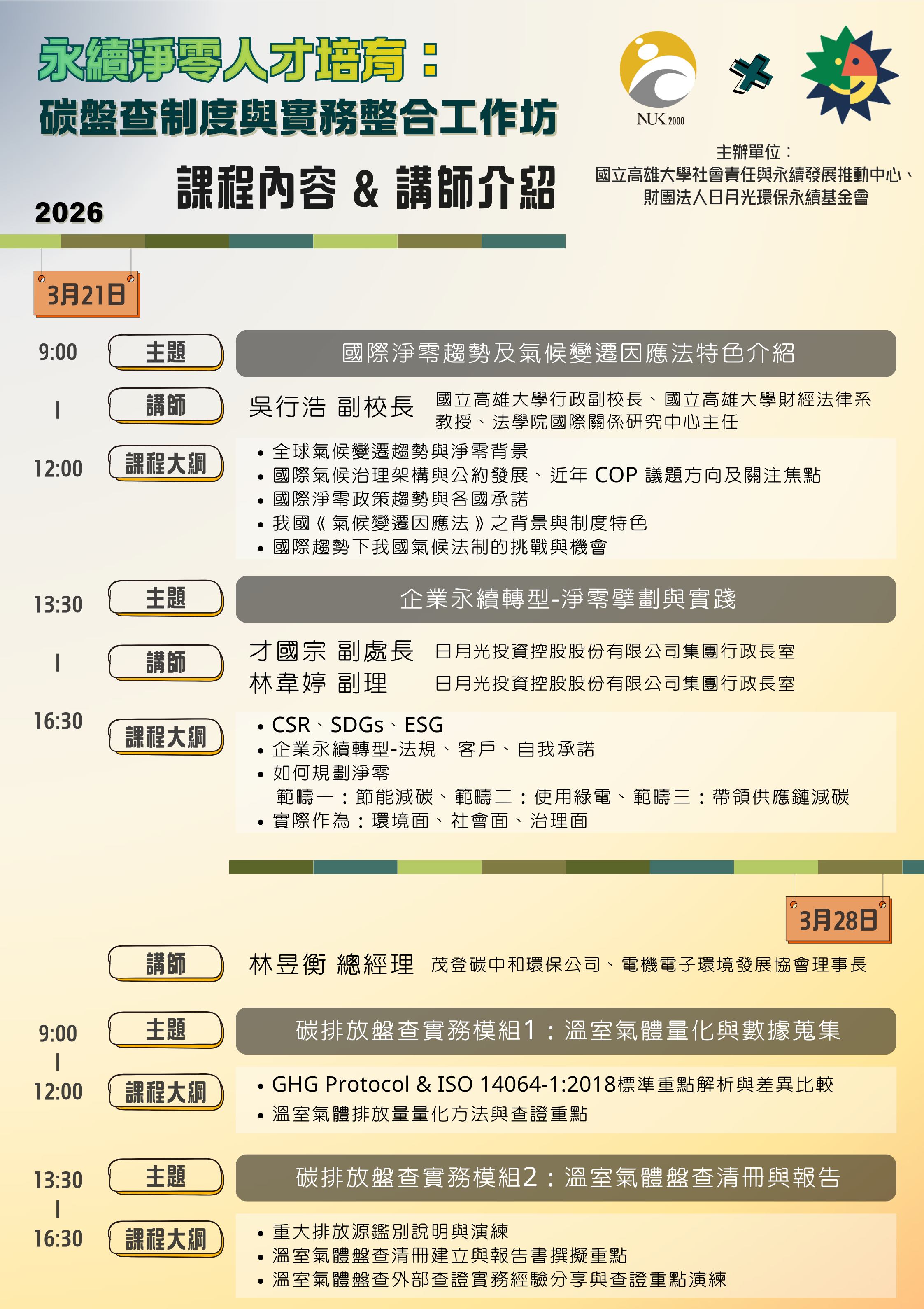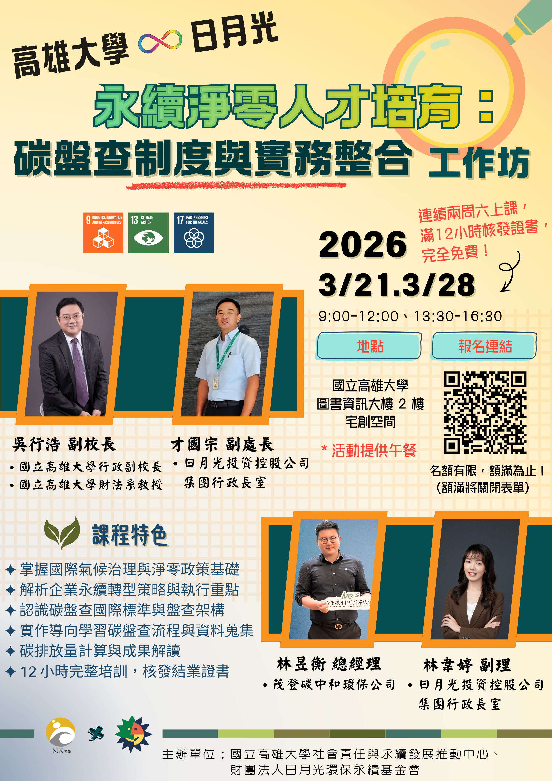 本校與日月光環保永續基金會將於今年3月21日(六)及3月28日(六)聯合舉辦「永續淨零人才培育:碳盤查制度與實務整合工作坊」,歡迎有興趣的師長及同學報名參加!